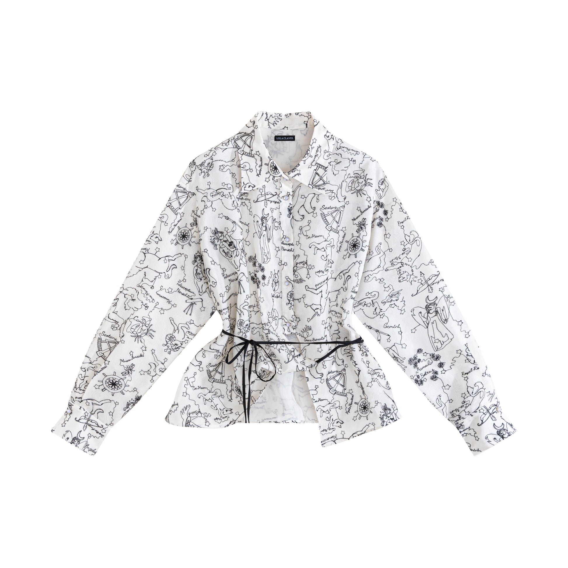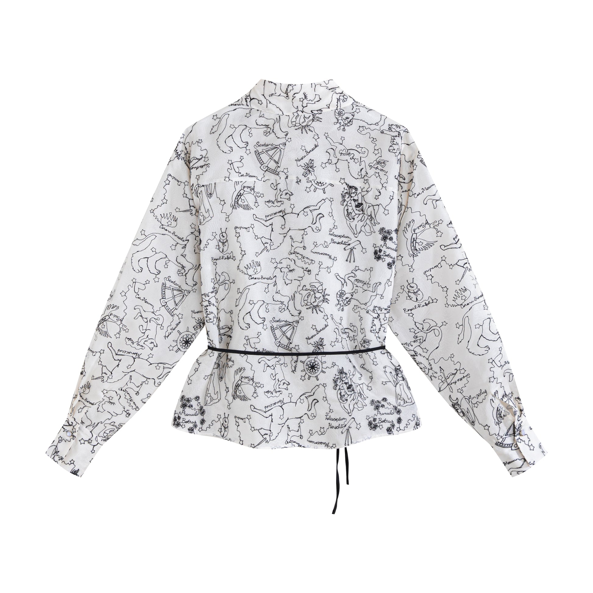 A delicate, hand-embroidered shirt crafted for effortless layering. Made from lightweight white organza, the shirt features intricate black embroidery inspired by celestial patterns, creating a subtle yet striking statement.